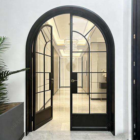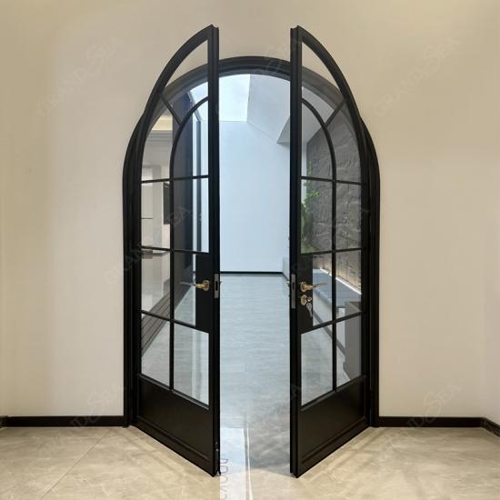 Este de alta gama Puerta doble francesa arqueada Presenta un marco de aleación de aluminio negro y un diseño de rejilla de vidrio. Además, está equipada con un sistema de cierre de alta seguridad que garantiza protección antirrobo y un excelente aislamiento térmico. El cuerpo de la puerta está fabricado en aluminio extruido 6063-T5 y acabado con un recubrimiento en polvo altamente resistente a la intemperie; no solo es excepcionalmente duradero, sino que también resulta ideal para su uso en villas, viviendas residenciales y espacios interiores.
