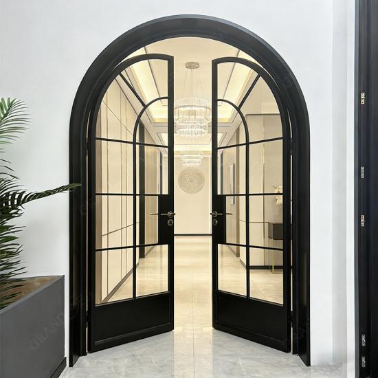 Puertas francesas de aluminio arqueadas de lujo con marco negro y doble puerta de entrada de vidrio templado.